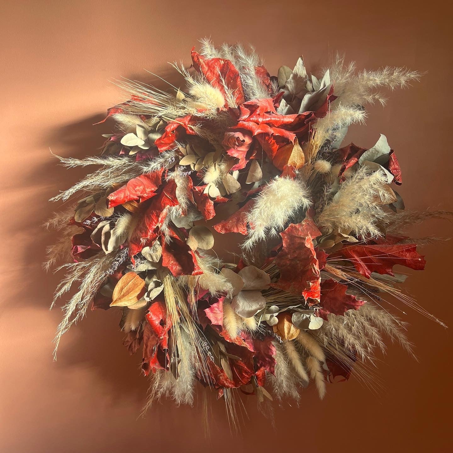 Oak leaf, eucalyptus, pampas and hops adorned with dried oranges and thistles.
