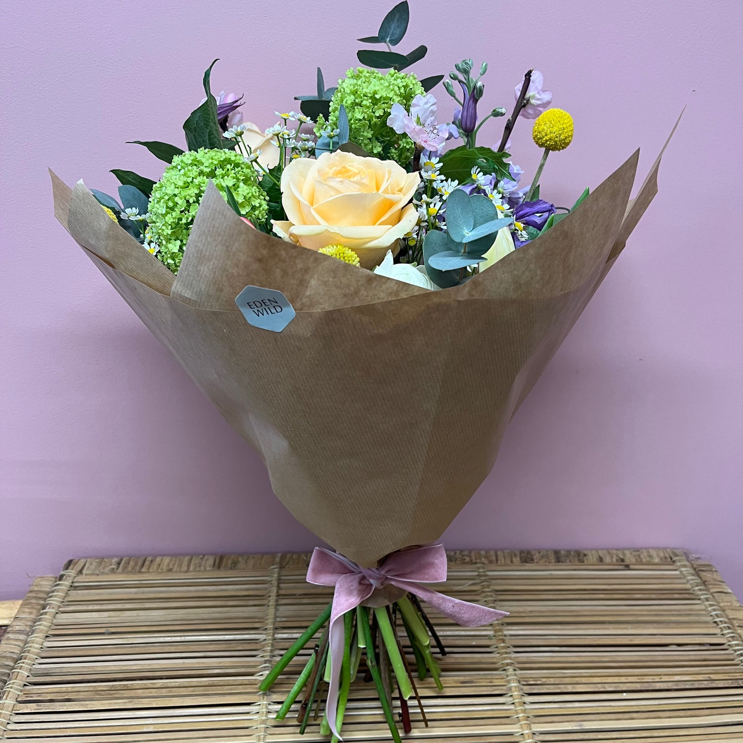 All of our EDEN WILD bouquets are created using an abundance of texture and tones giving a wilder style and the illusion they have been just picked from a garden. Created bespoke to each order, chosen flowers may vary according to the time of year but will embrace the seasons guided by your colour pallet and design. Each order is presented in wrapping in keeping with the rustic yet stylish vibe and all flowers are delivered in a bubble of water to ensure ultimate freshness for your occasion. To care for your blooms, be sure to recut the stems and freshen the water every two to three days. Avoid placing flowers in direct light or heat. We aim to ensure all blooms have at least a week life span but this is dependant on the blooms chosen, time of year and environment conditions, some blooms will last less time and others will thrive for weeks. ‘Delivery can be preferenced AM or PM but specific times cannot be guaranteed. Delivery on all items is £6.50 or you can select click and collect for free at the checkout. Orders through the website should be ordered by 1pm for delivery the following day but for same day delivery please contact the shop for availability.