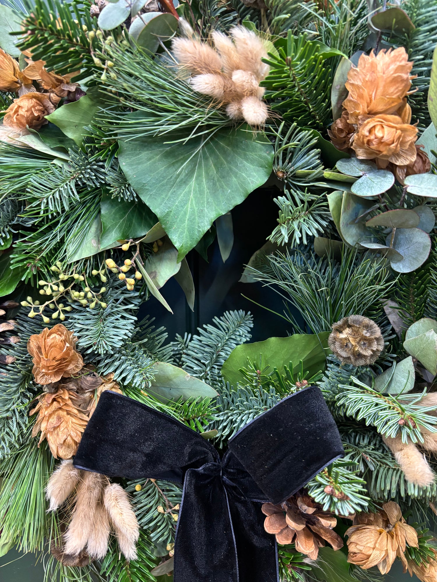 A natural take on a christmas wreath with nods to Scandinavian style. Dried florals and natural tones adorn the fresh foliage wreath.