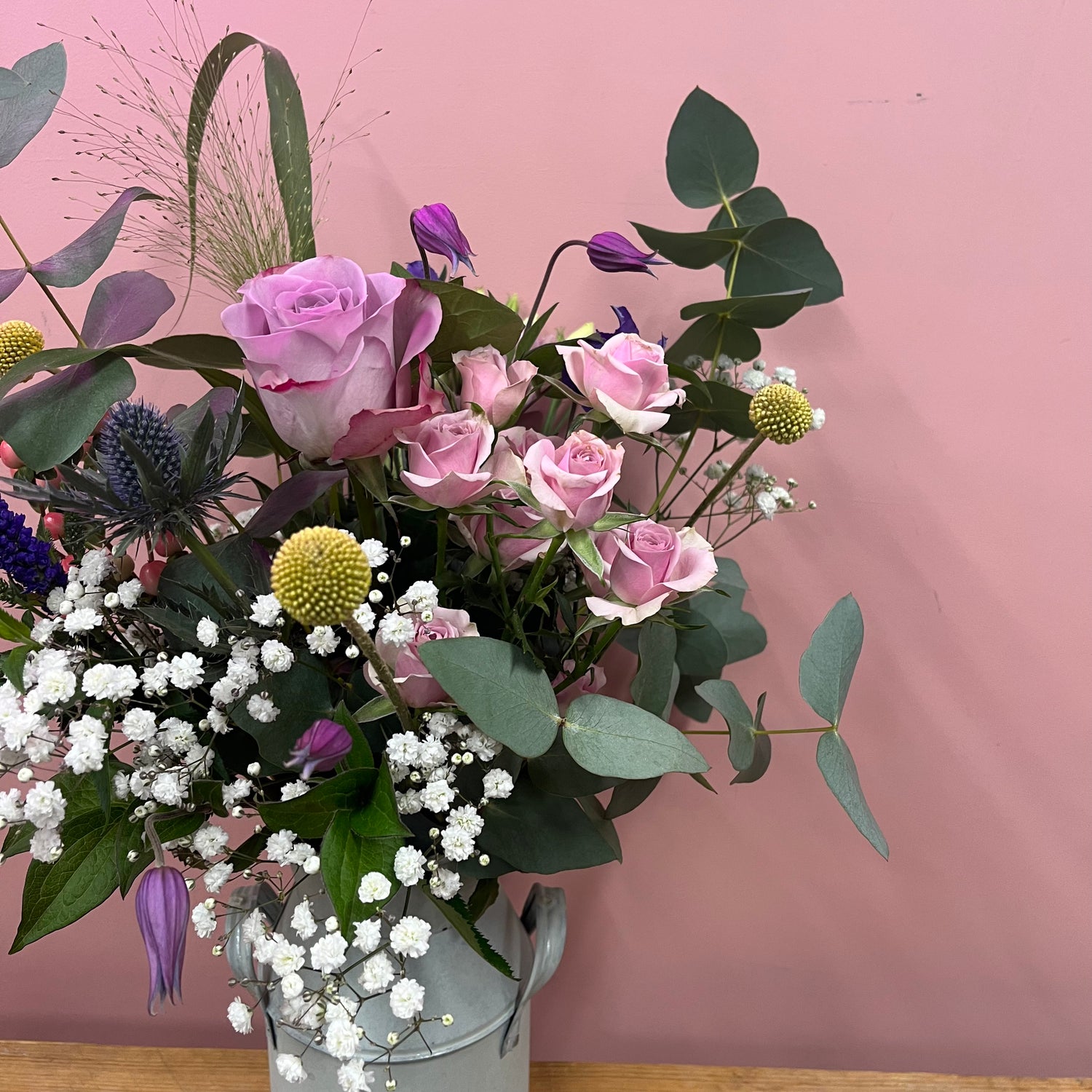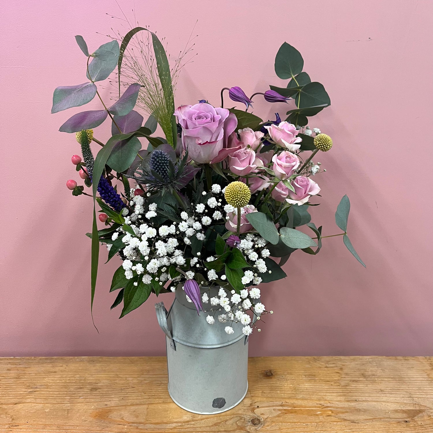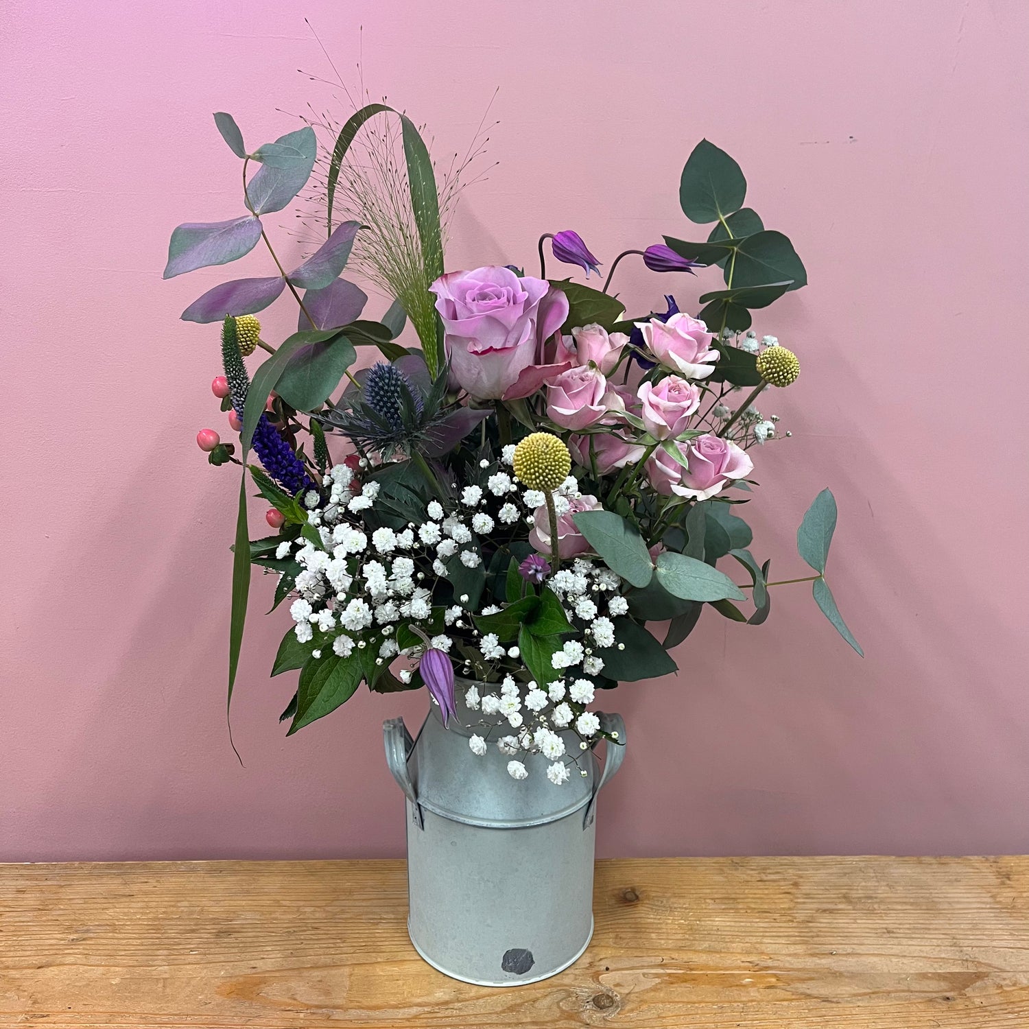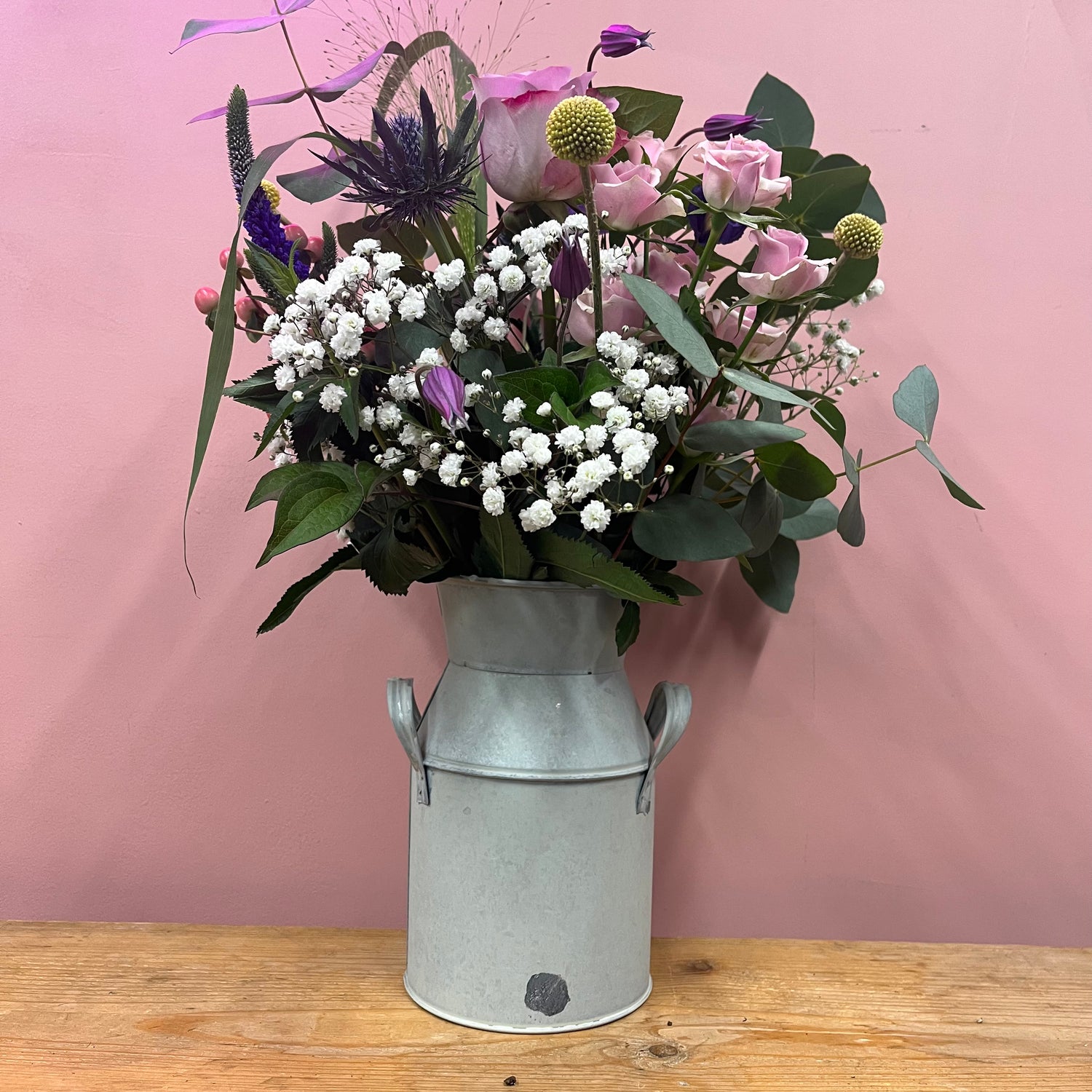 These rustic country vases made a stylish container for some meadow blooms. Readily arranged in a rustic tin churn or ceramic jug, a selection of beautiful country garden flowers in a mixture of spring colours. A bundle of blooms and the perfect gift to appreciate a mama who's bossing it! Pictured medium.