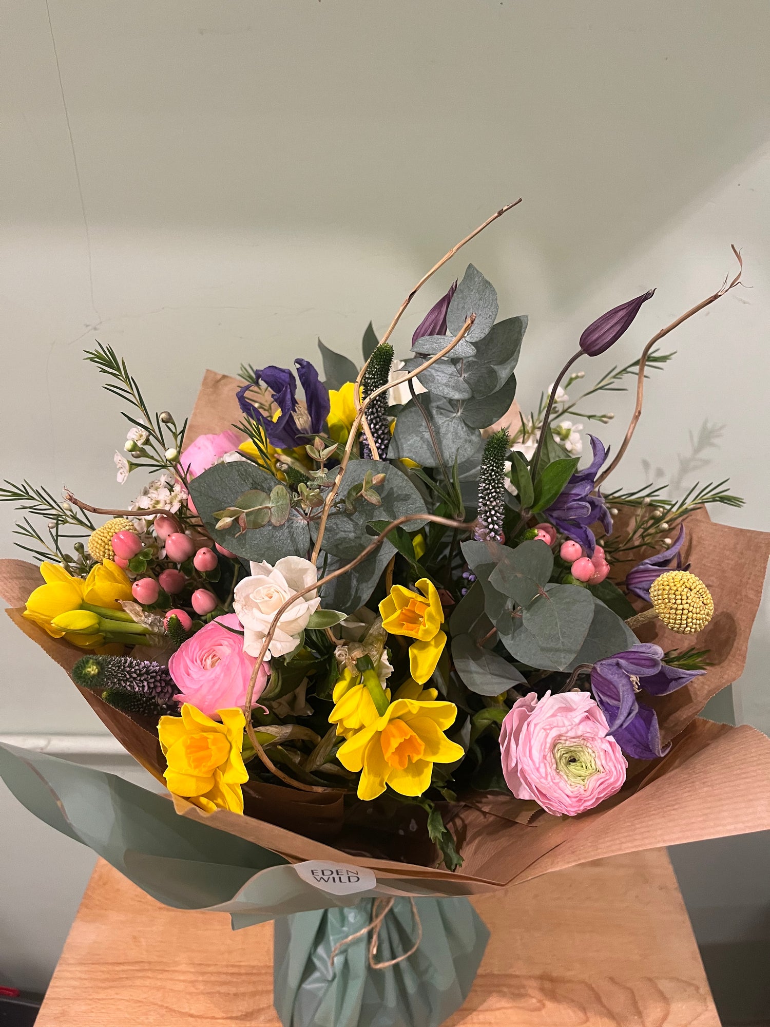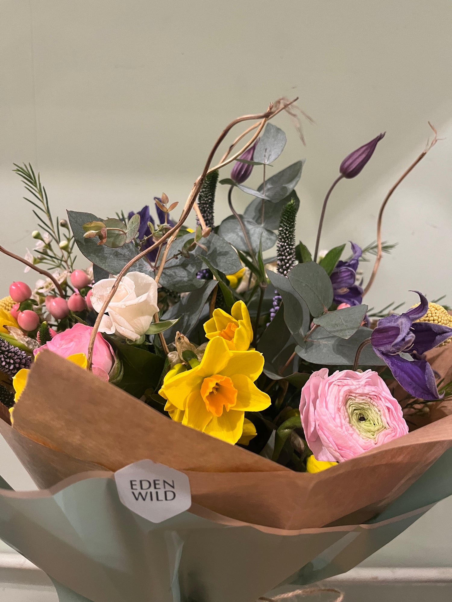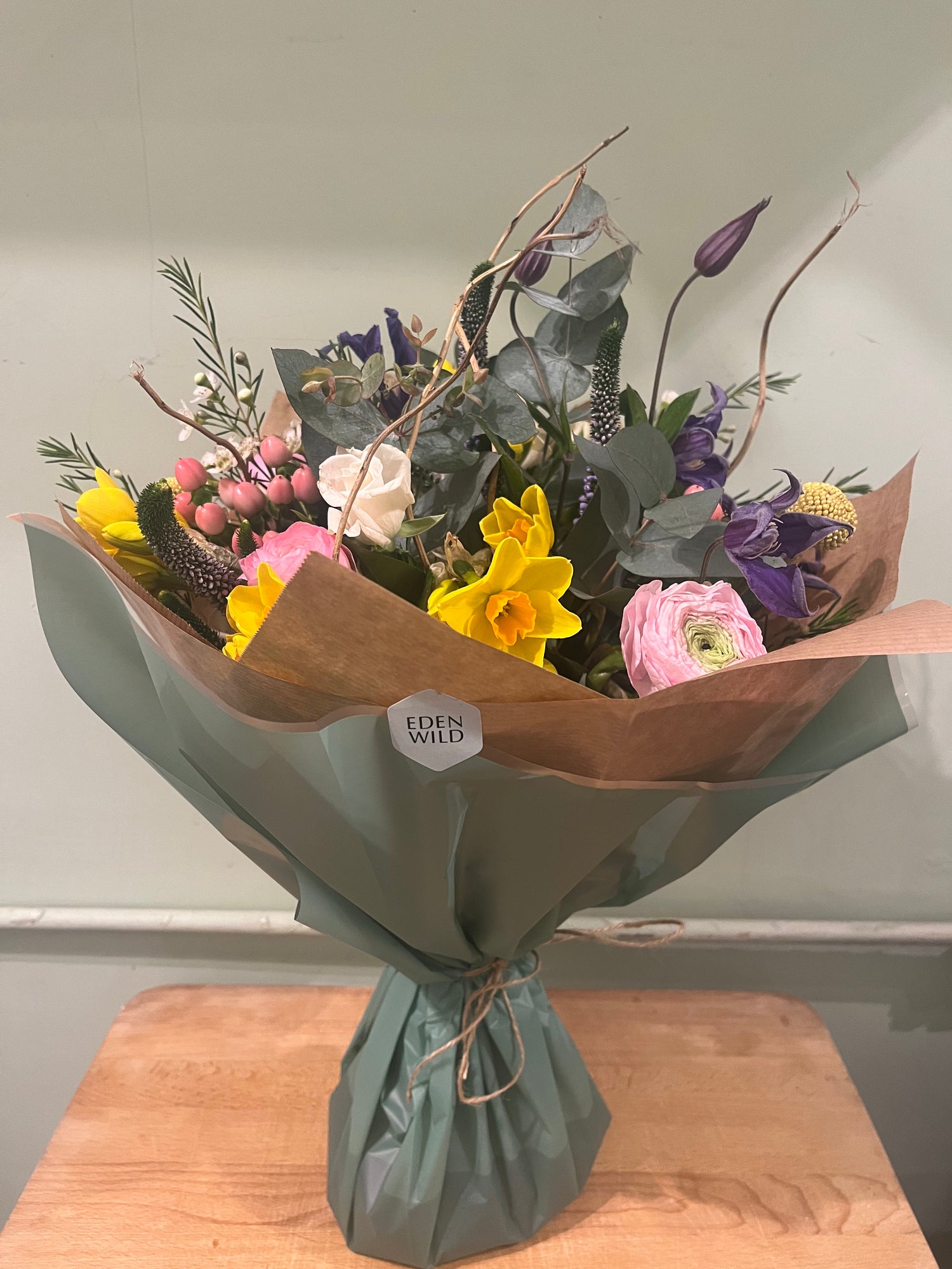 All of our EDEN WILD bouquets are created using an abundance of texture and tones giving a wilder style and the illusion they have been just picked from a garden. Created bespoke to each order, chosen flowers may vary according to availability. Each order is presented in wrapping in keeping with the rustic yet stylish vibe and all flowers are delivered in a bubble of water to ensure ultimate freshness for your occasion. To care for your blooms, be sure to recut the stems and freshen the water every two to three days. Avoid placing flowers in direct light or heat. We aim to ensure all blooms have at least a week life span but this is dependant on the blooms chosen, time of year and environment conditions, some blooms will last less time and others will thrive for weeks. ‘Delivery can be preferenced AM or PM but specific times cannot be guaranteed. Delivery on all items is £6.50 or you can select click and collect for free at the checkout. Orders through the website should be ordered by 1pm for delivery the following day but for same day delivery please contact the shop for availability.