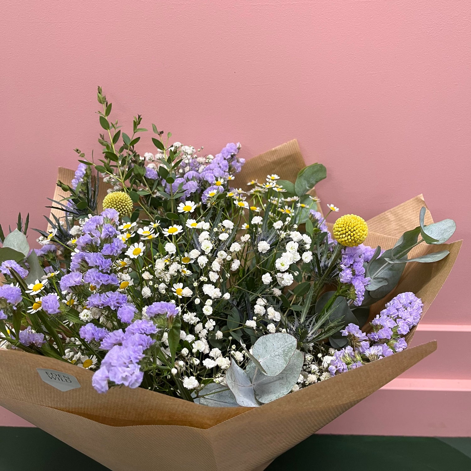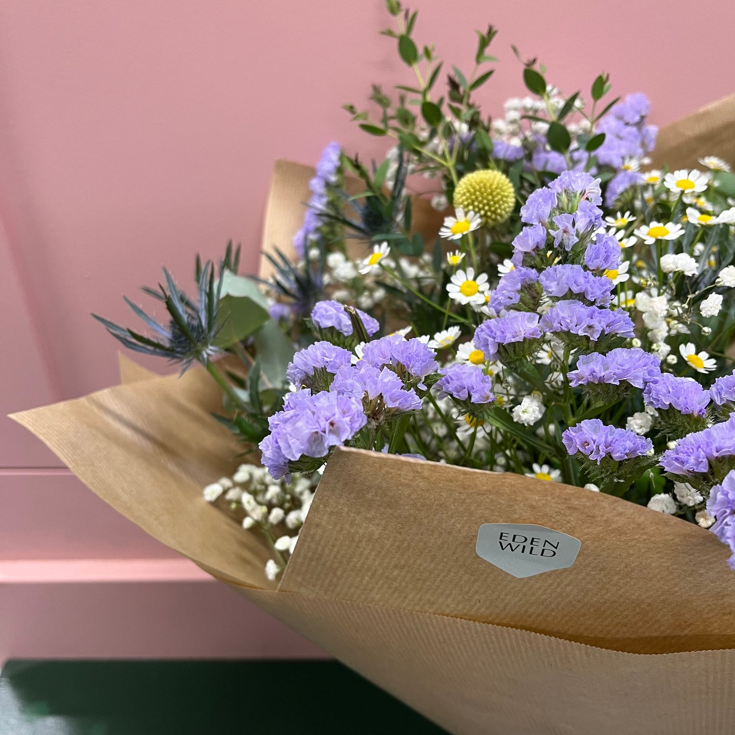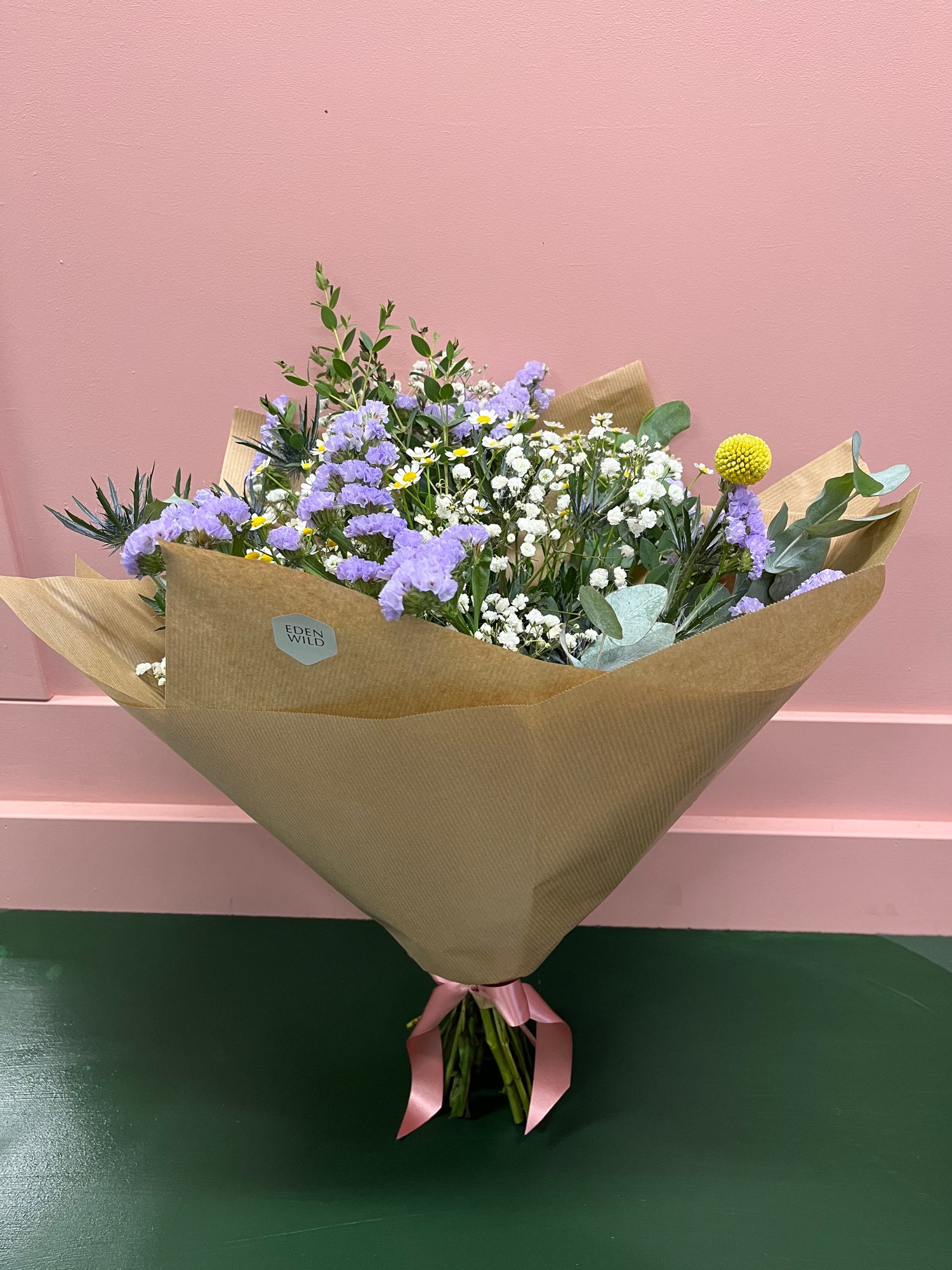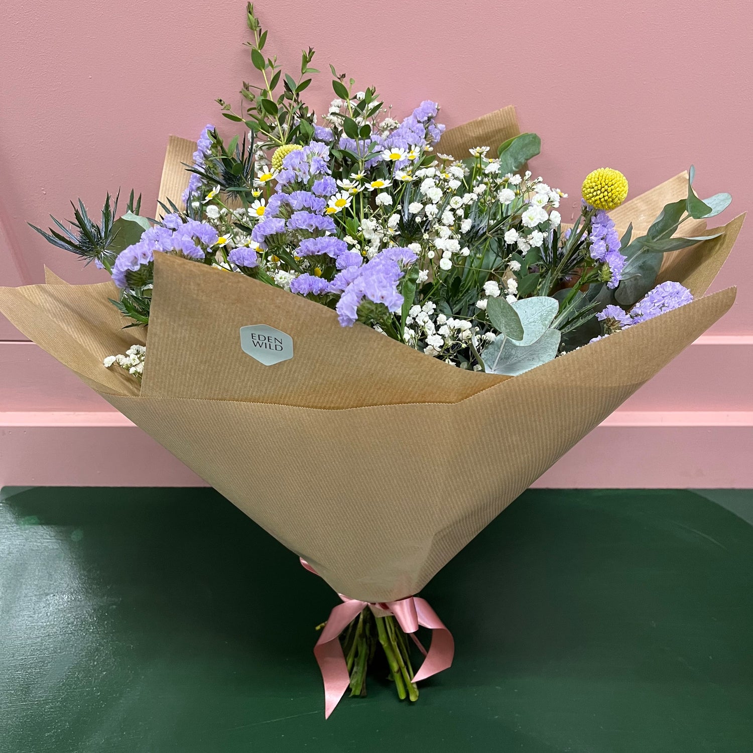 All of our EDEN WILD bouquets are created using an abundance of texture and tones giving a wilder style and the illusion they have been just picked from a garden. Created bespoke to each order, chosen flowers may vary according to the time of year but will embrace the seasons guided by your colour pallet and design. Each order is presented in wrapping in keeping with the rustic yet stylish vibe and all flowers are delivered in a bubble of water to ensure ultimate freshness for your occasion. To care for your blooms, be sure to recut the stems and freshen the water every two to three days. Avoid placing flowers in direct light or heat. We aim to ensure all blooms have at least a week life span but this is dependant on the blooms chosen, time of year and environment conditions, some blooms will last less time and others will thrive for weeks. ‘Delivery can be preferenced AM or PM but specific times cannot be guaranteed. Delivery on all items is £6.50 or you can select click and collect for free at the checkout. Orders through the website should be ordered by 1pm for delivery the following day but for same day delivery please contact the shop for availability.